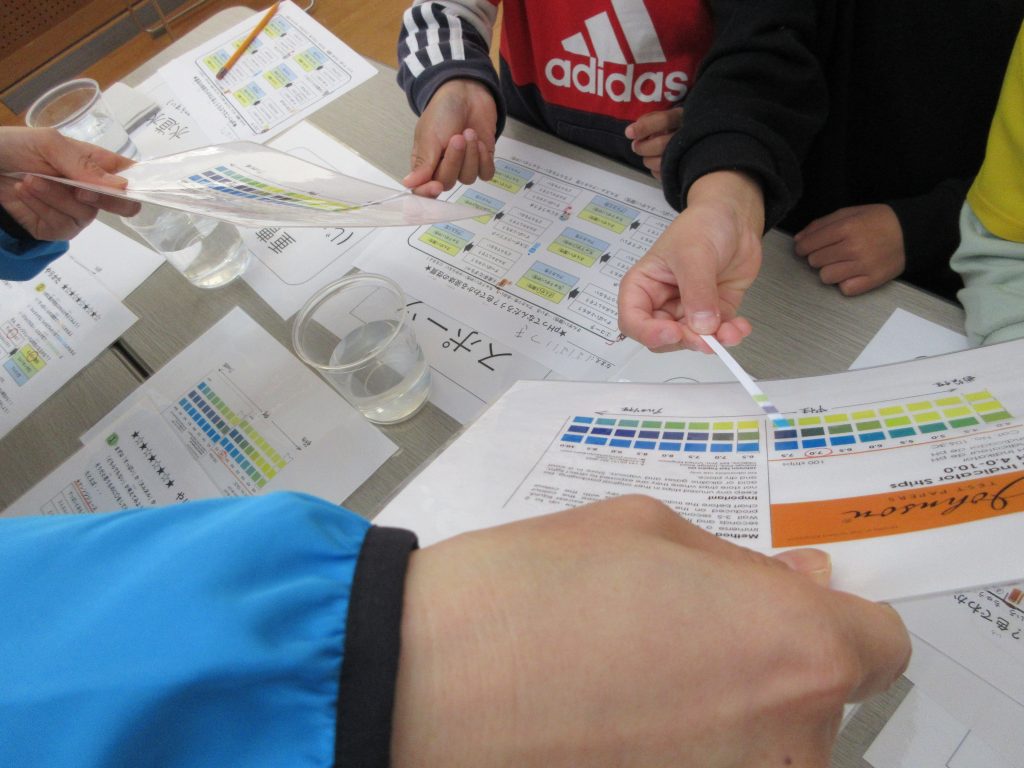 実験は、「CODパックテスト」「試験紙を用いたpH測定」「ティッシュとトイレットペーパーの性質の違いについて」を3グループに分かれて行いました。